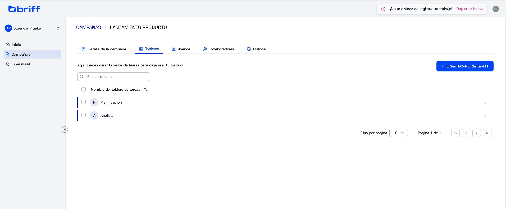 Las tareas están agrupadas dentro de tableros, y cada tablero representa una etapa específica del proceso.