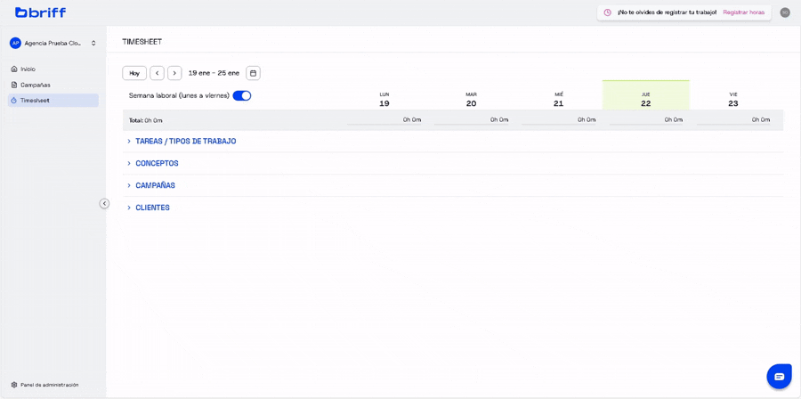 - En la solapa izquierda se encuentra la sección Timesheet.
