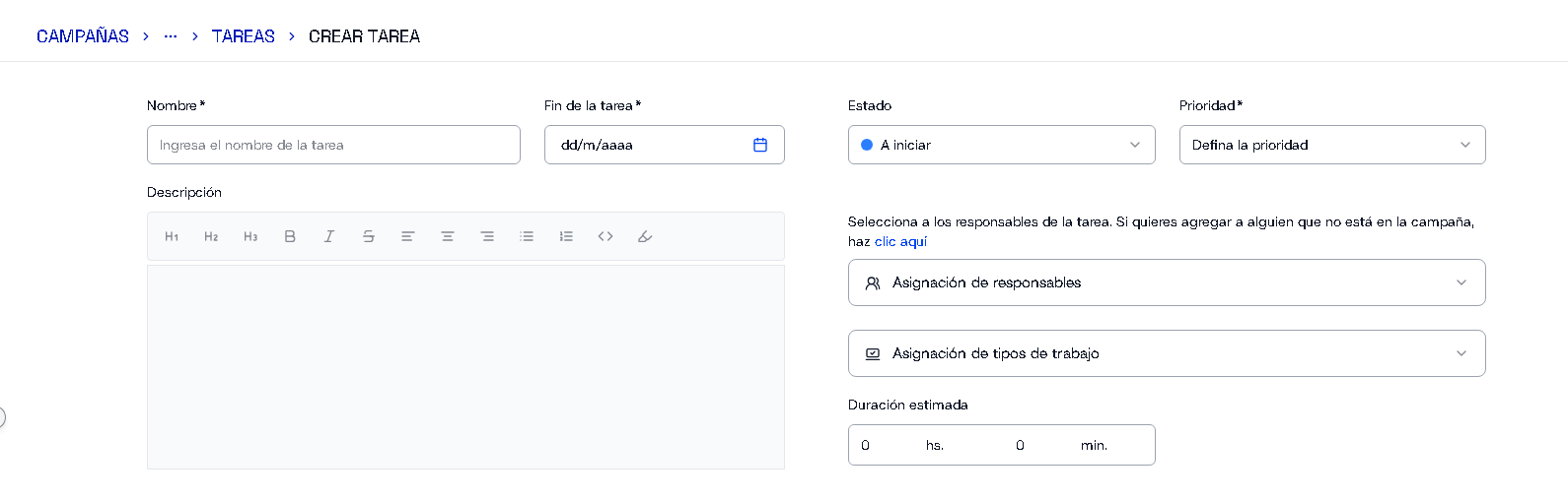Al momento de cargar una tarea, es importante completar los siguientes campos: