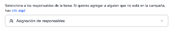 - Es posible que al crear la campaña no se haya incluido a todos los colaboradores. Por eso, al generar una tarea, puedes agregar a quien falte y seleccionarlo como responsable en ese mismo momento.